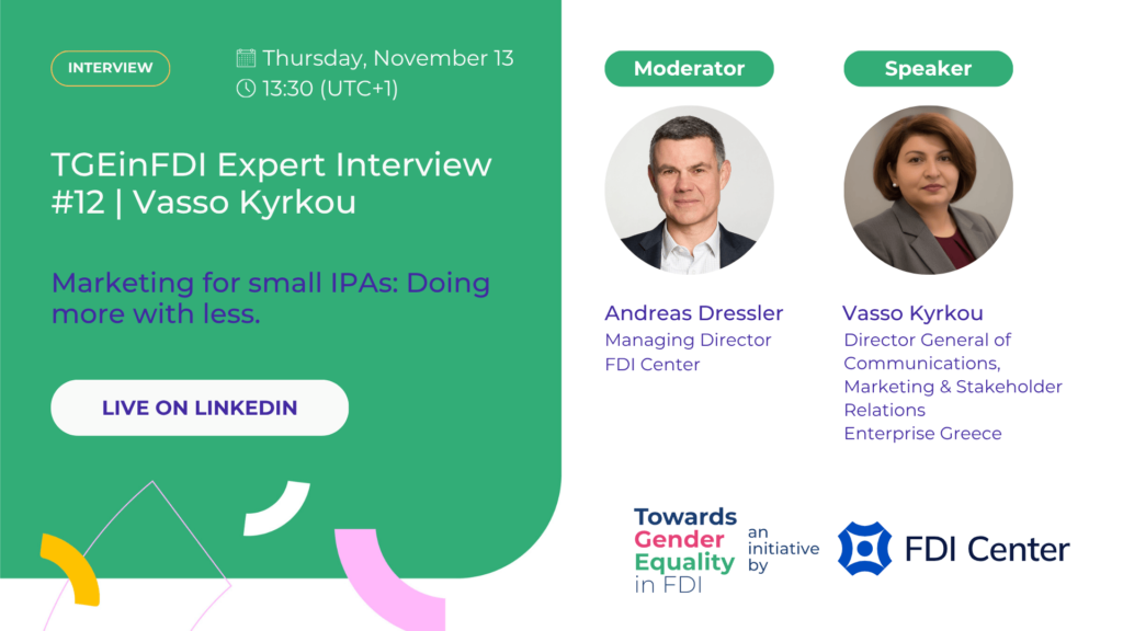 This interview will focus on marketing fundamentals and best practices for small investment promotion agencies. The conversation will cover topics from building a place brand and crafting meaningful partnerships to implementing marketing practices that support the investor journey and project pipeline. Vasso will also share how Enterprise Greece integrates gender equality into their outreach and programs.